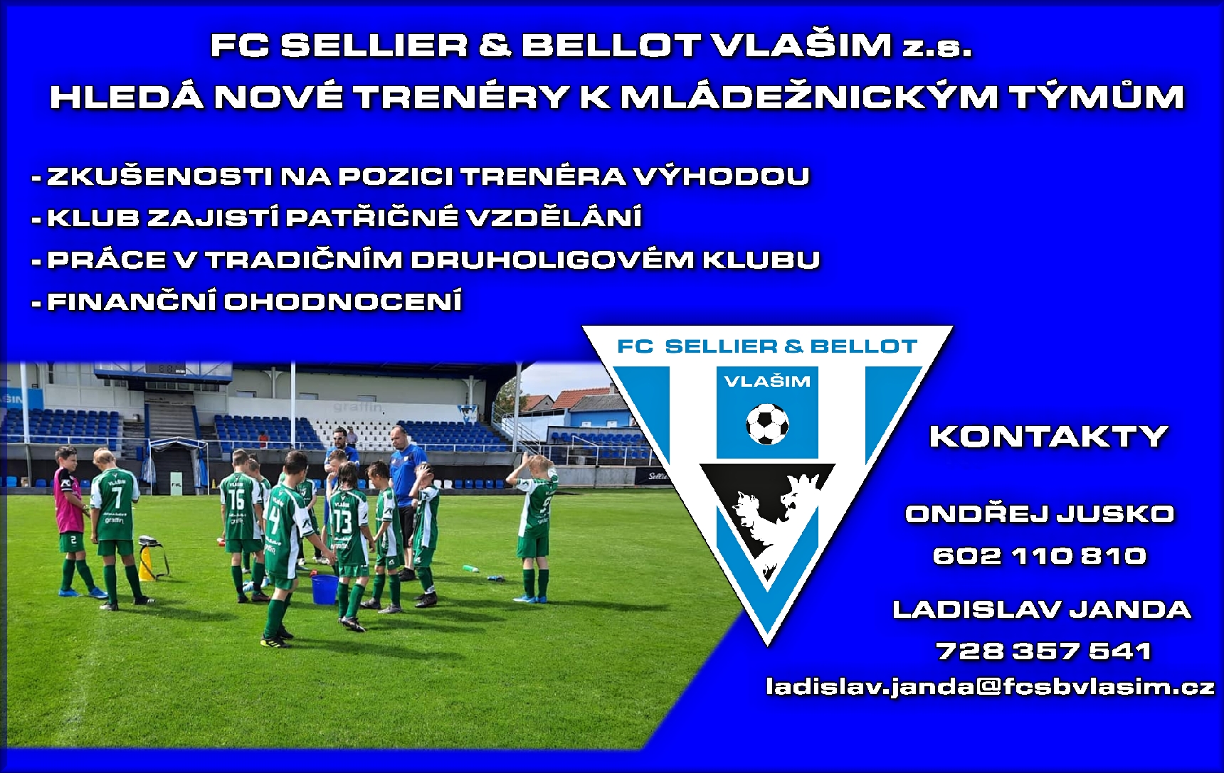Fotbalový klub FC Sellier & Bellot Vlašim hledá nové posily do svého trenérského týmu! Jedná se o trenéry k mládežnickým týmům, zejména přípravkovým kategoriím! Neváhejte nás kontaktovat a pokusit se vychovat nejen pro Vlašim, ale celý český fotbal, nové talenty!